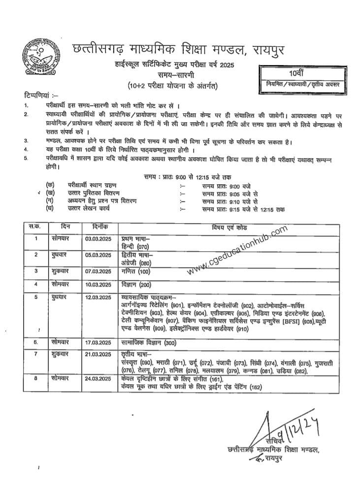 छत्तीसगढ़ माध्यमिक शिक्षा मंडल ने 10वीं और 12वीं कक्षा की प्री-बोर्ड और मुख्य परीक्षाओं का टाइम टेबल जारी कर दिया है।