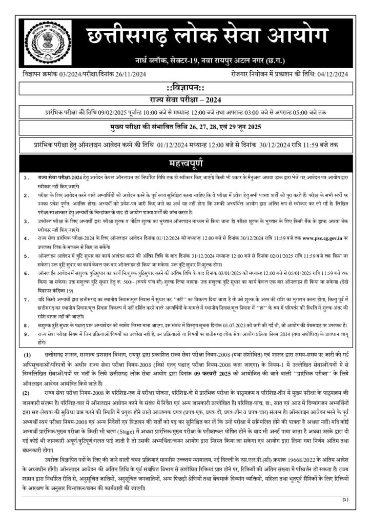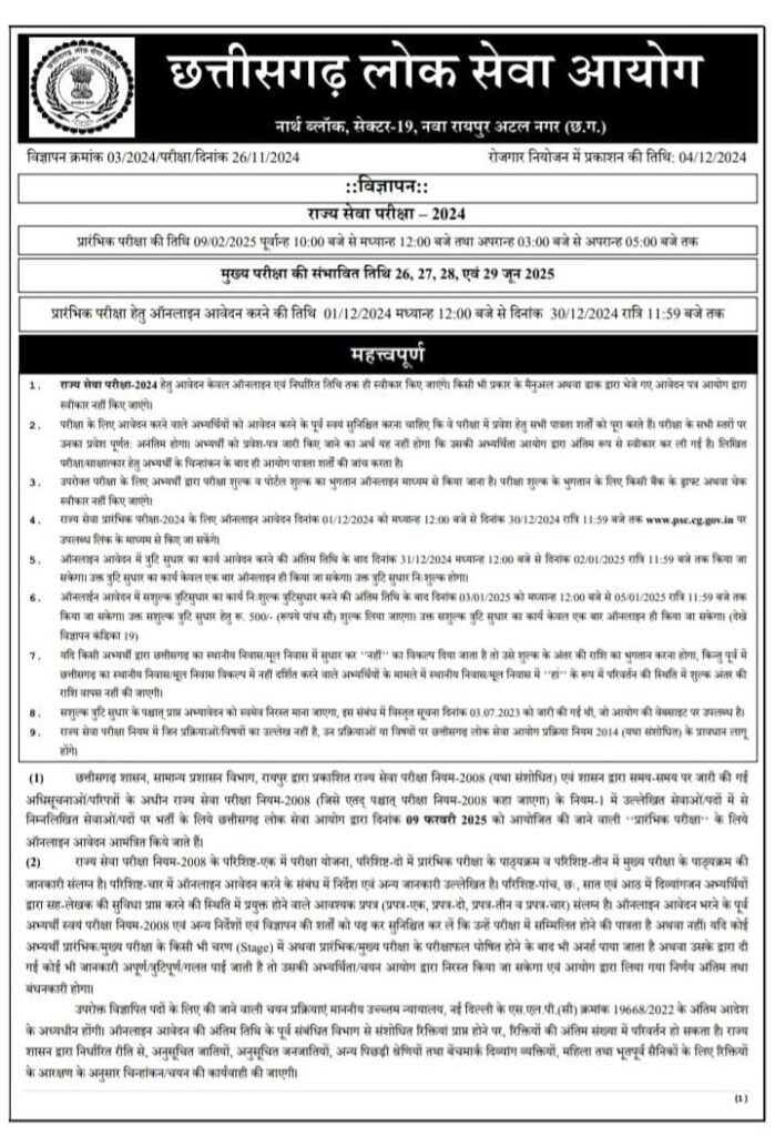 राज्य सेवा परीक्षा 2024 के लिए ऑनलाइन आवेदन की प्रक्रिया शुरू है। सोमवार, 30 दिसंबर तक फॉर्म भरे जाएंगे। इस बार 246 पदों पर भर्ती होगी। प्रारंभिक परीक्षा 9 फरवरी 2025 को होगी। जबकि मुख्य परीक्षा जून में आयोजित की जाएगी। इसी तरह इस बार डीएससी का पद भी है। पीएससी- 2023 में यह पद नहीं था। इसके अलावा इस बार जो पद हैं उनमें डिप्टी कलेक्टर, छग राज्य वित्त सेवा अधि अधिकारी, जिला आबकारी अधिकारी, सहायक संचालक (वित्त विभाग), सहायक संचालक (पंचायत एवं ग्रामीण विकास विभाग), सहायक संचालक / जिला महिला एवं बाल विकास अधिकारी, सहायक संचालक समाज कल्याण विभाग, मुख्य कार्यपालन अधिकारी जनपद पंचायत, बाल विकास परियोजना अधिकारी, छग अधीनस्थ लेखा सेवा अधिकारी, नायब तहसीलदार, राज्य कर निरीक्षक, आबकारी उप निरीक्षक, उप पंजीयक, सहकारी निरीक्षक / सहकारिता विस्तार अधिकारी, सहायक जेल अधीक्षक का पद शामिल है।